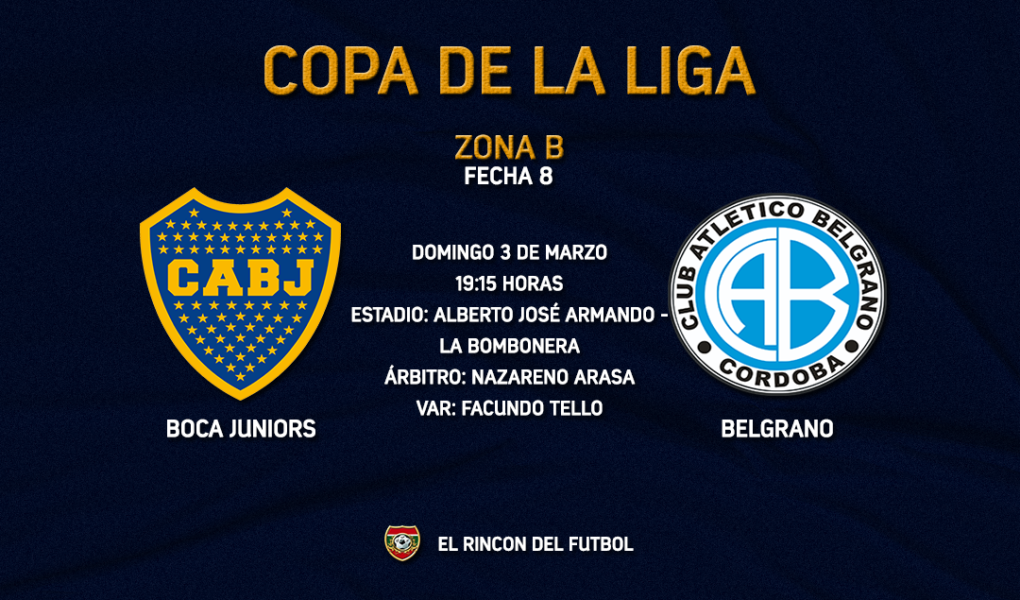 Por la 8° fecha de la Copa de la Liga, Boca Juniors recibirá a Belgrano de Córdoba en La Bombonera a las 19:15 horas. El árbitro del encuentro será: Nazareno Arasa y en el VAR: Facundo Tello.