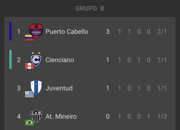 - Puerto Cabello (2) – (1) Atlético Mineiro: Jean Castillo y Jiovany Ramons (PC); Dudu (AM).