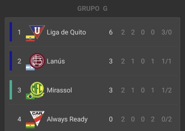 - Liga de Quito (2) – (0) Mirassol: Yerlin Quiñónez y José Quintero (LQ).