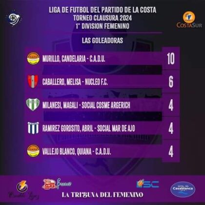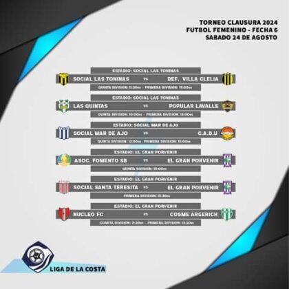 El futbol femenino costero tendrá una gran jornada con las lideres de Social Mar de Ajo recibiendo a Defensores Unidos, en choque de invictas, el escolta Cosme Argerich juega ante el ascendente Núcleo, las “piratas” de Social Santa Teresita, quienes marchan en el podio, visitan a El Gran Porvenir, las bicampeonas de Las Toninas reciben a sus pares del Defensores de Villa Clelia, mientras que Atlético Las Quintas será local ante Popular Lavalle.