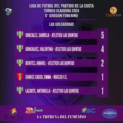 Quinta División: Bianca Veja Social Mar de Ajó (6), Oriana Moskalik (El Gran Porvenir (6), Ailen Ferreira (Atl Las Quintas) (3), Zoe Morales (Soc. Las Toninas) 3, Keila Ríos (Soc. Mar de Ajó) 3.