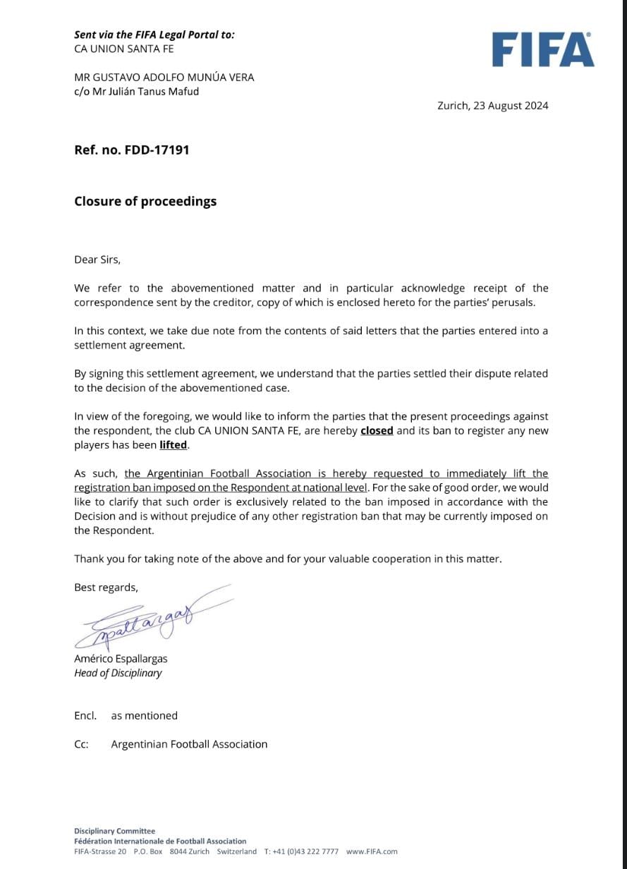 “En la jornada de ayer se firmó el acuerdo entre las partes y hace instantes el portal legal de FIFA informó al club el levantamiento de la inhibición que pesaba sobre nuestra institución.” Comenta en su primera parte el comunicado de Unión en sus redes. Para la alegría de toda su gente ya que podrá incorporar jerarquía en su equipo.